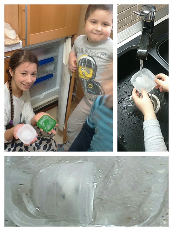 Они довольно долго ломали голову, но всё - таки догадались, что речь о морозилке. Там был накануне заморожена бумажка с паролем. Что бы добыть пароль, им нужно разморозить лёд.Случилась неприятность, что в колбочку с паролем попала вода и бумажка размокла и порвалась. Пришлось подсказывать. Детишечки ввели пароль в компьютер и тадааам...их поздравил Коул.