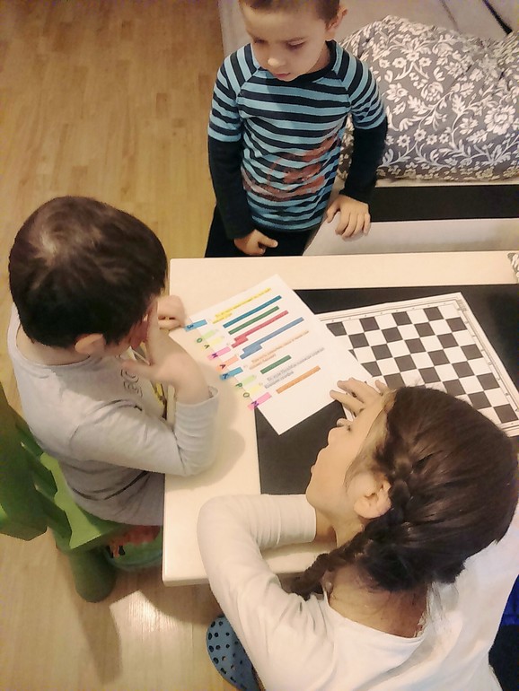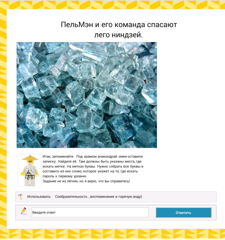 На листе, который подложила под леговский храм анакондраев были напечатаны подсказки, где эти буковки искать. Всё это дети сделали быстро.