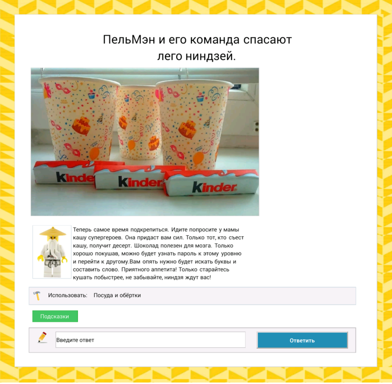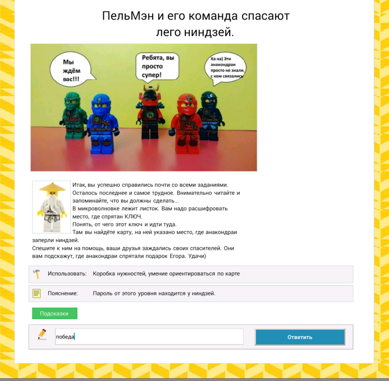 Возникла задумка сделать квест. В поисках идей для заданий я набрела на совершенно замечательный сайт, с помощью которого придумала и оформила это развлечение. Самой составлять квест было очень прикольно. Всё очень удобно, понятно, огромный простор для фантазии, есть готовые шаблоны (если нет времени или фантазии). Одним словом, респект создателям! А самое главное- супербюджетно! За 199 руб я активировала свой квест и было нам счастье...