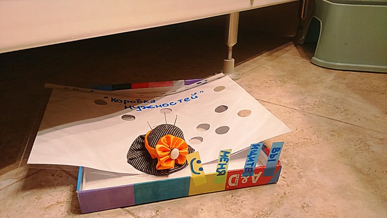 Дети догадались, что это ванна, побежали туда и на полу нашли "Коробку нужностей", в которой были трафарет и подушечка с иголками.