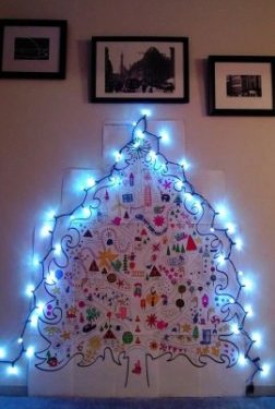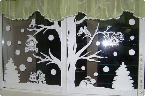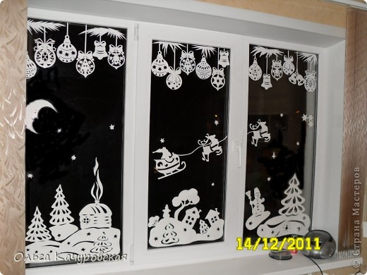Мы так украшали окна, получилось красиво, по краям губкой с зубной пастой прошлись, получился как иней)