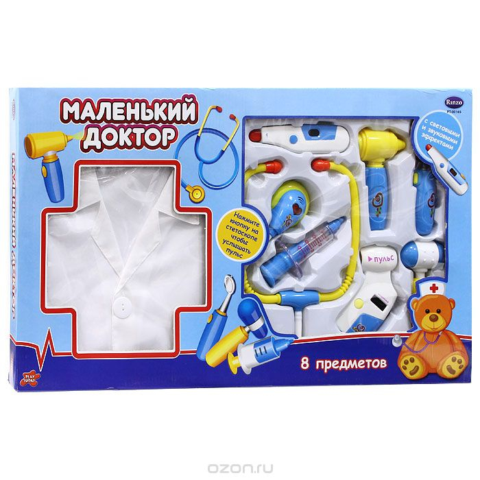 Наборы Маленький доктор. Оба хороши! В одном есть халат и инструменты со звуками, другой полон невероятных медицинских приборов.