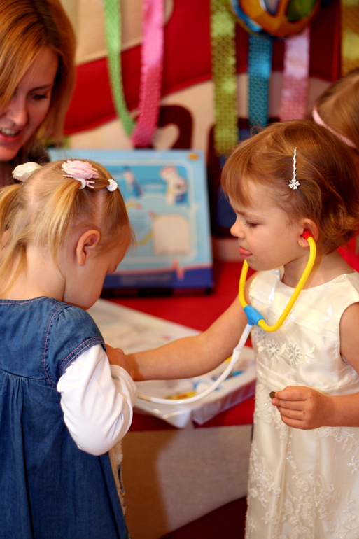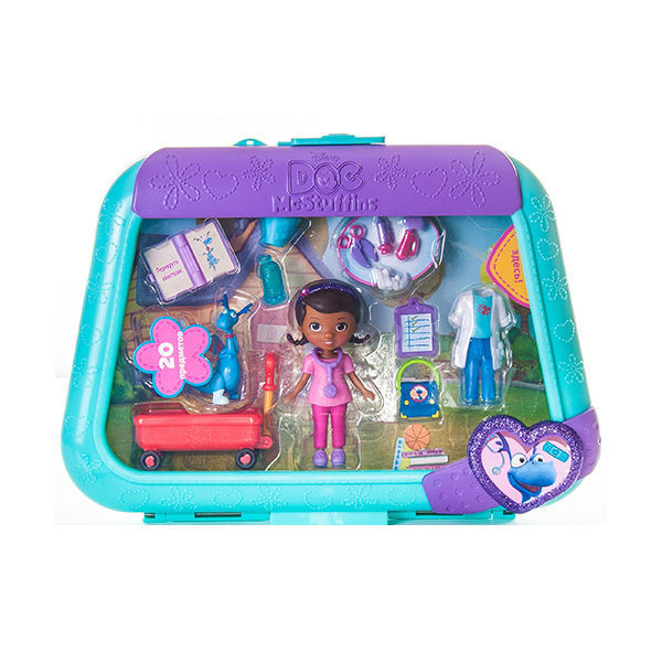 Чемоданчик Доктор Плюшева. Уважаем этого мульт-героя, поэтому с удовольствием лечим зверят, катаем их на тележке и бесконечно переодеваем наряды на кукле.