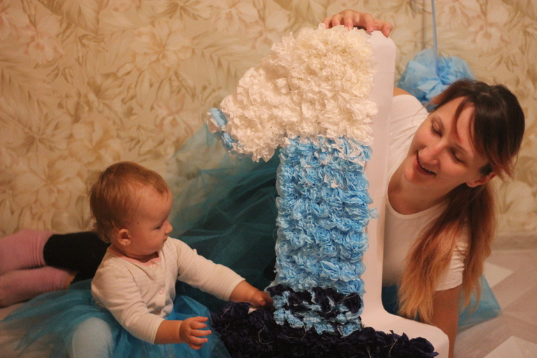 Единичка - о, мое творение! Форму сделала еще в июле, а салфетки клеила в последние дни, и даже пришлось маму подключать на кручение украшательств) и конечно юбки для меня и маленькой принцессы))) и из такой же сетки на ножках ее стульчика были маленькие юбочки, но не сфотографированы
