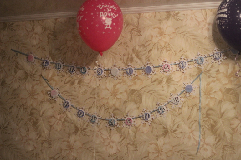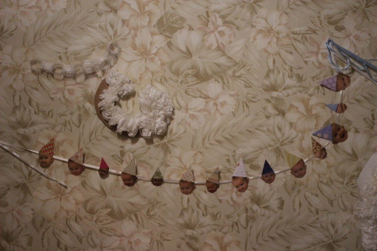 гирлянда с Софиными моськами (предлагала гостям найти количество портретов именинницы среди прортретов разных малышей все справились, хотя искали подвох))
