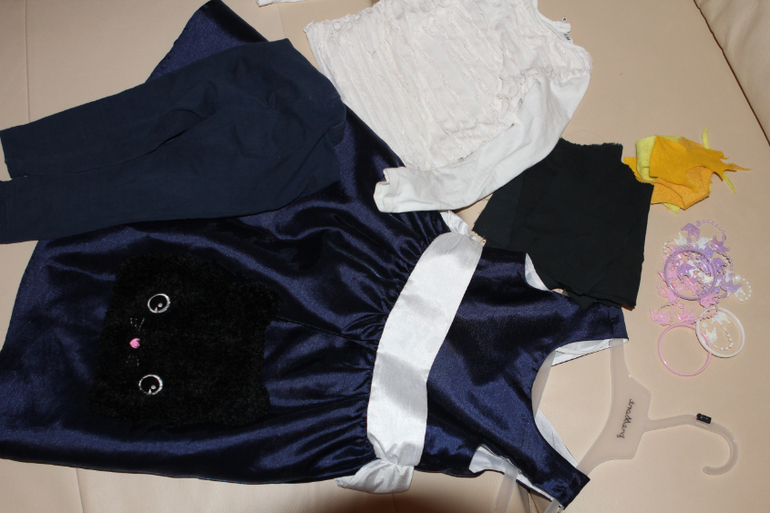 Белая кофточка, из которой мы выросли - не понадобилась, изначально планировалась для жабо и создания "белобокости", но потом, поняла, что это лишнее.Шапка НМ в виде кошки - просто чудо, именно благодаря ей костюм стал "приличный". Ну и все остальное по мелочи.