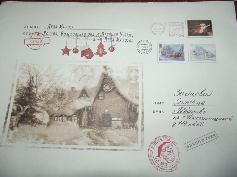 162340, Россия, Вологодская область, город Великий Устюг, дом Деда Мороза.