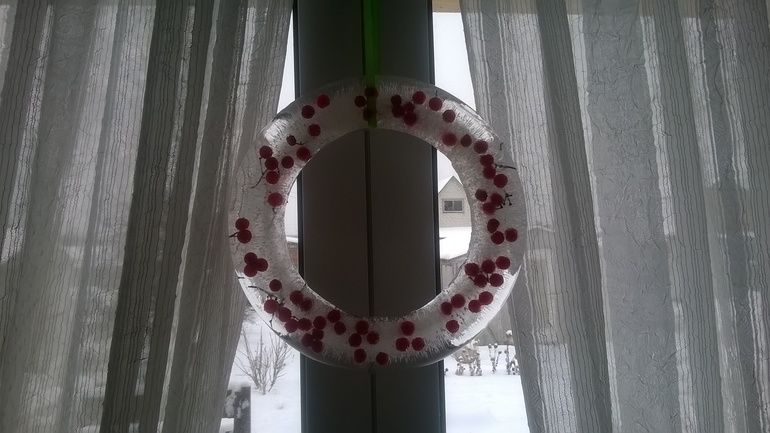 Это мой пробничек - кастрюлька в кастрюльку, вода, ягоды калины и на мороз. Застыло, кастрюльку в горячую воду и вынуть ледяное колечко, привязать ленточку и главное найти место куда его потом повесить. Медальенами маленькими можно и елку уличную украсить. В общем Новый год на даче - это сказка!!!