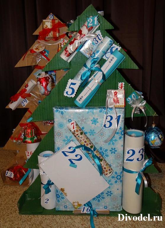 Основа календаря - гофрокартон, из которого вырезан силуэт елки. А подарочки разного размера, формы приклеиваются к елке с двух сторон. Вот, может эта идея кого-нибудь вдохновит на творчество) И еще я придумала много заданий для адвента.