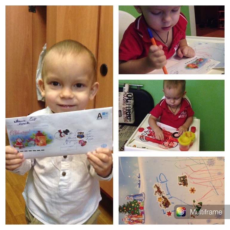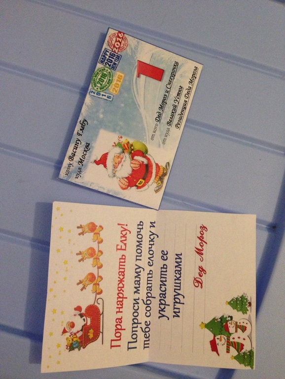 1 Декабря подкидываем в почтовый ящик ответ от Деда Мороза, где тот пишет, что письмо получил, знает какой малыш молодец, что вел себя хорошо, но хотел бы еще, чтобы ребенок выполнил его задания. Нам Дед Мороз прислал ответ сразу с первым подарком, новогодней книгой.