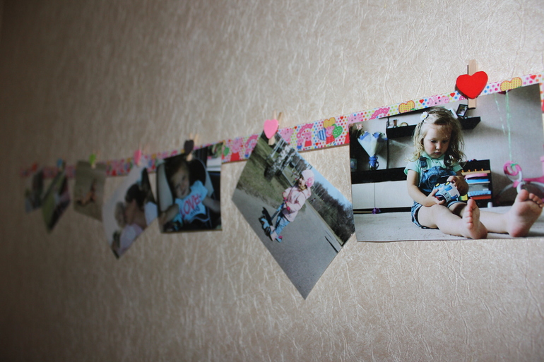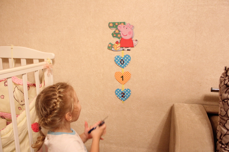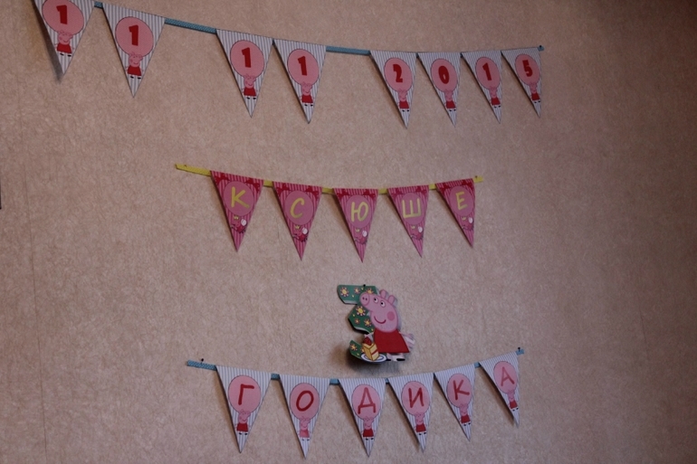 На алиэкспрессе заказала ленточку с Пеппой и прищепки с сердечками и развесила на них выборку фотографий именинницы за минувший год.