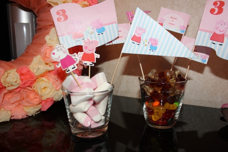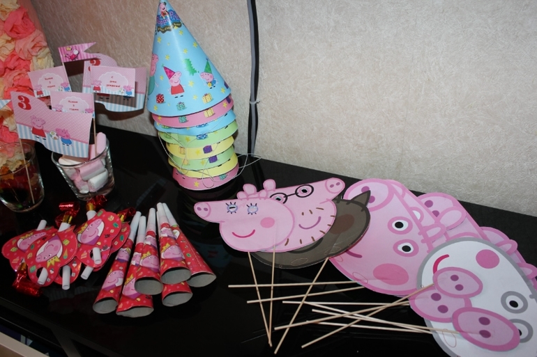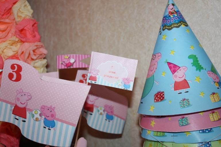 P.S. С радостью отдадим таким же юным фанатам свинки нашу аттрибутику. Маски, флажки (как на фото ниже), колпачки (они без резиночки, у нас есть дежурные колпачки еще с годика, я на них сверху эти одевала), свистульки. Украшения на бутылки с именем, но его можно отрезать и останется просто Пеппа. А вдруг тезка наша попадется, тогда еще и именные флажки подойдут)) На супер качество не претендую, все самодельное (кроме свистулек).