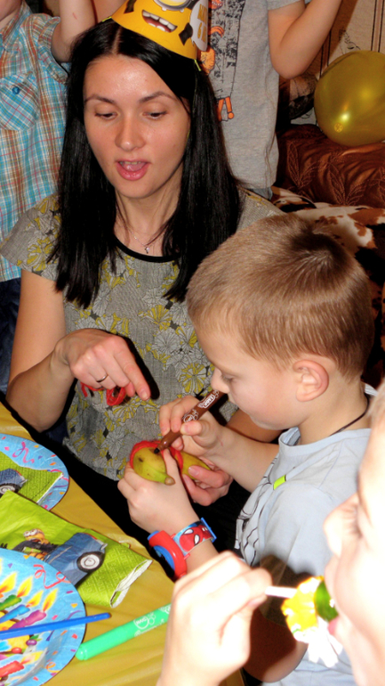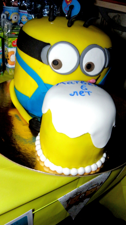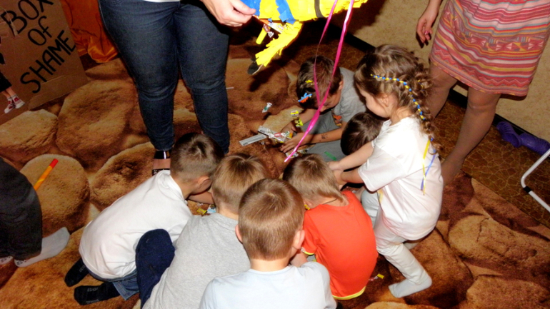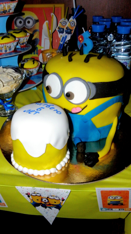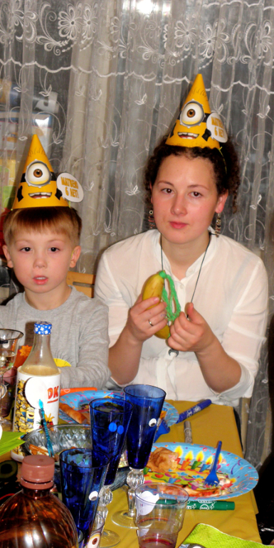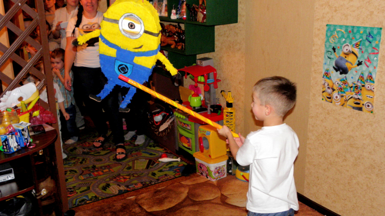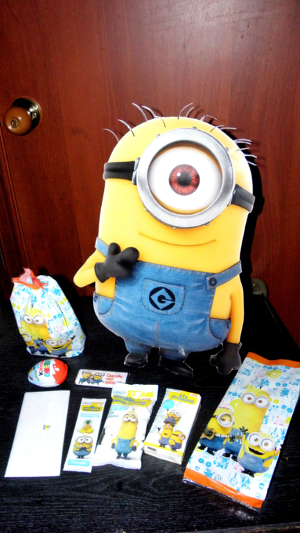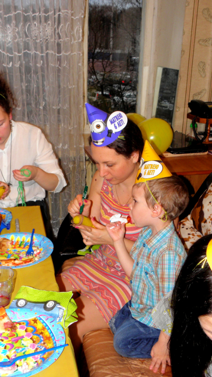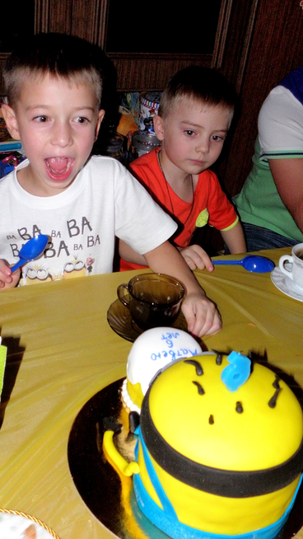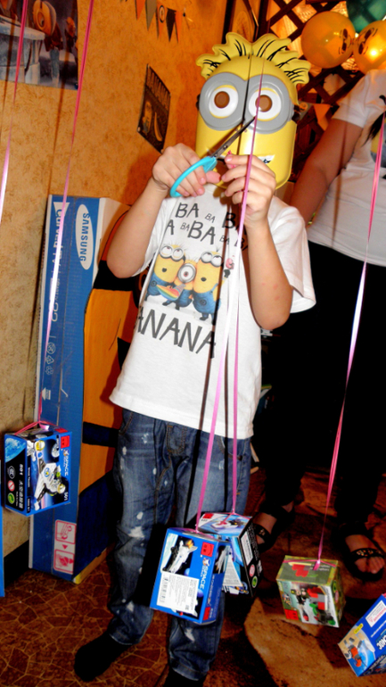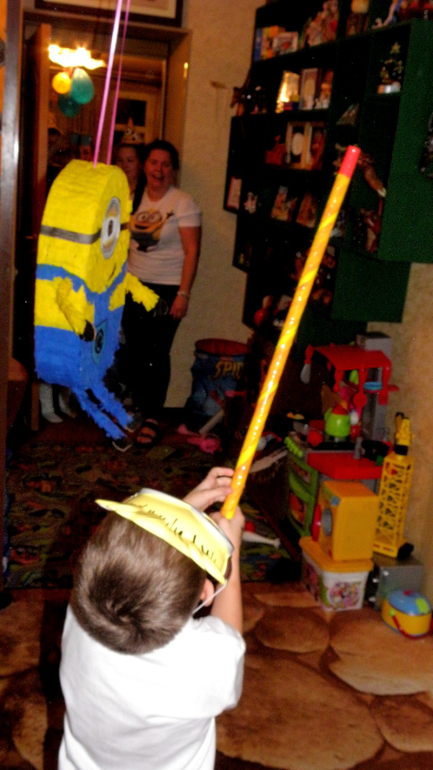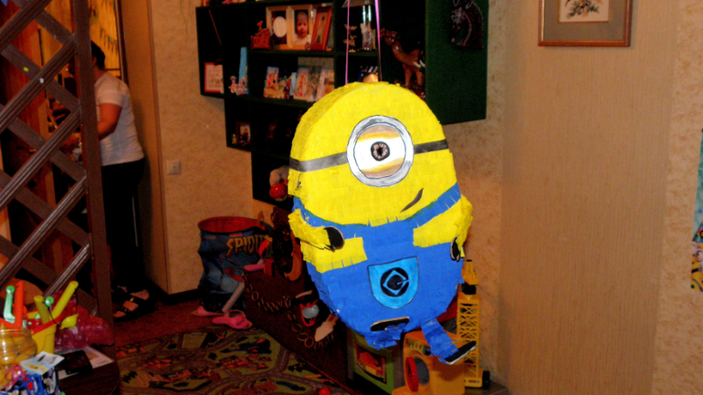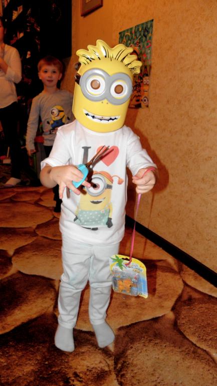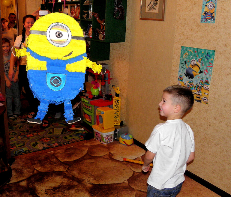 Завершили вечер мы "ПИНЬЯТОЙ",поначалу пытались играть по правилам,надели Матюхе маску и он бил не глядя по ней,пиньята не поддавалась,мы его пожалели и сняли маску,все равно не смог ее разбить (рукодельница постаралась и сделала нам ее из картона полностью,как можно разбить картон я не представляю и даже после моей просьбы оставить ослабленные хотя бы бока,это не помогло нам победить Миньона),в итоге он просто отлетел на пол и я под шумок бока разорвала,высыпав все богатство) дети если честно ошалели от многообразия,советую всем проводить Пиньяту,у меня были разные конфеты,жвачки,чупа чупсы,игрушки из киндеров) когда карманы были забиты,уже раздавали всем пакеты,чтобы забрать все домой)))))