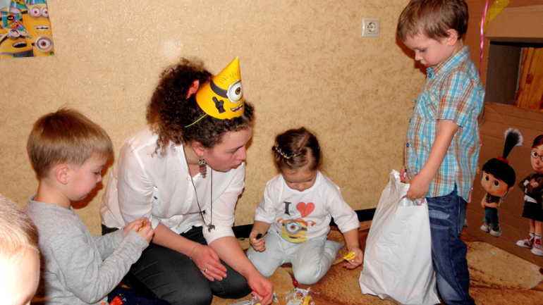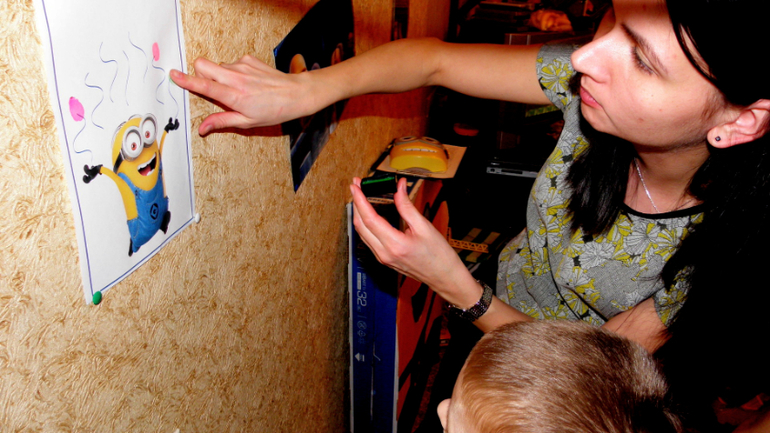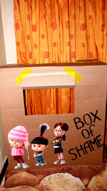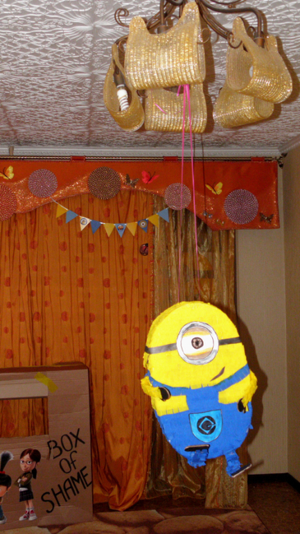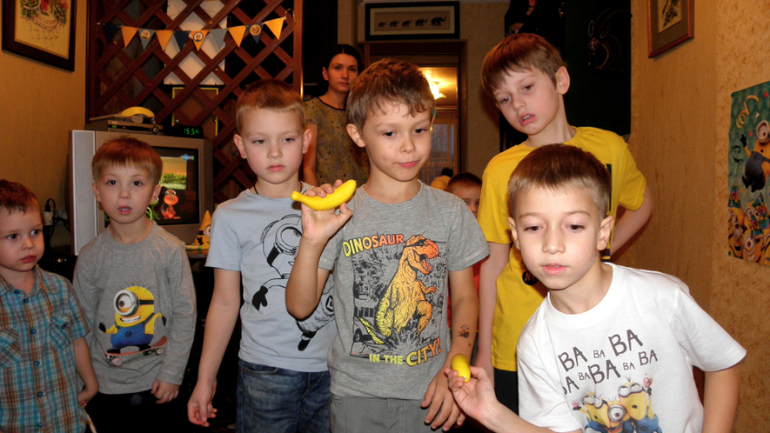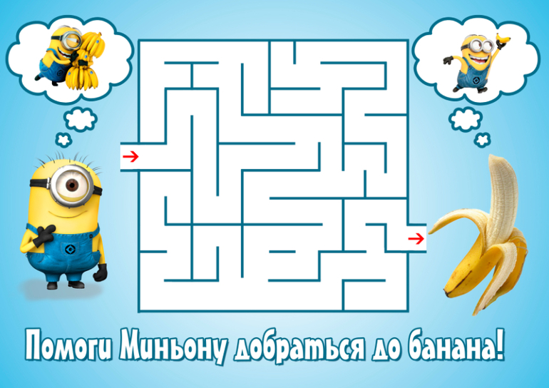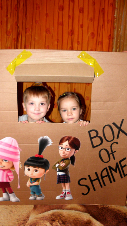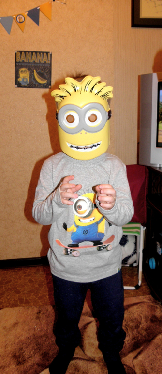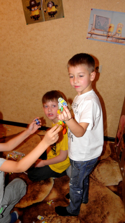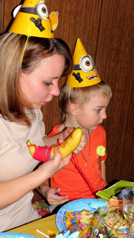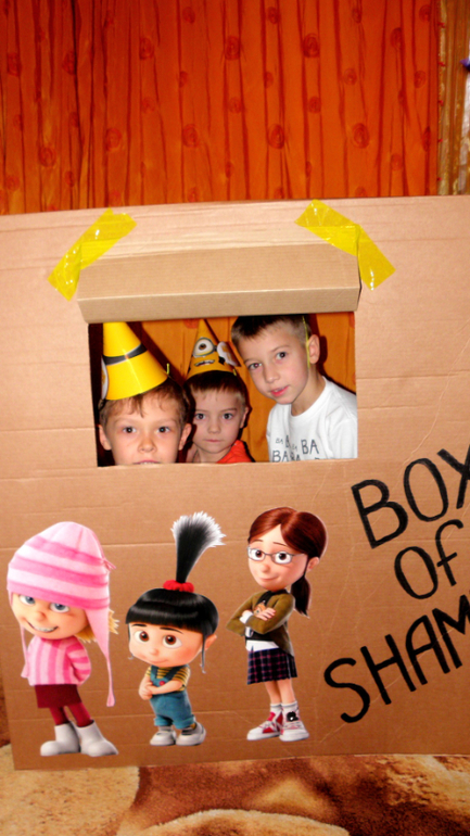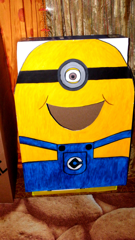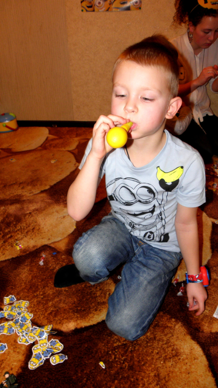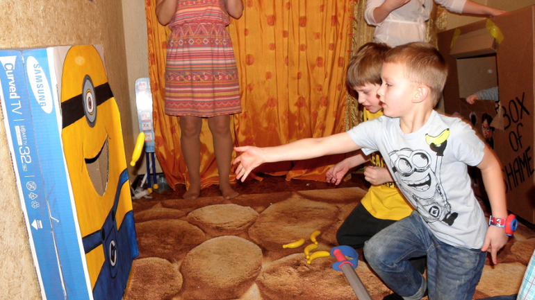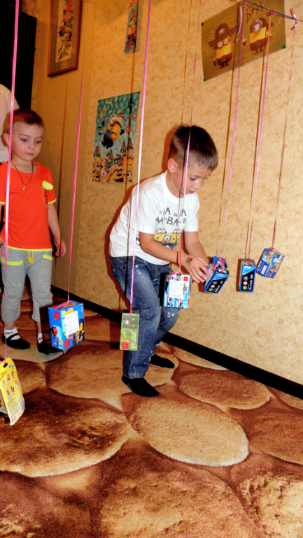 Третий конкурс был "НАКОРМИ МИНЬОНА",нарисовали миньона на ватмане,прикрепили к коробке,вырезали рот,нужно было попасть пенопластовым бананом в рот) дети были в восторге,не хотели отходить от него)