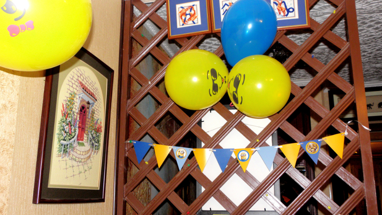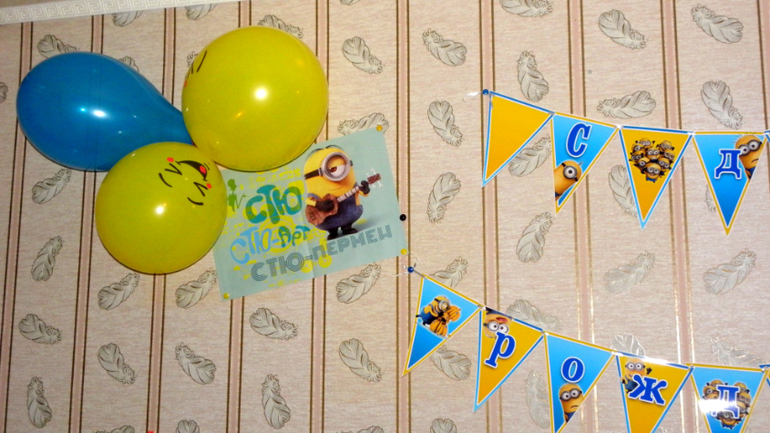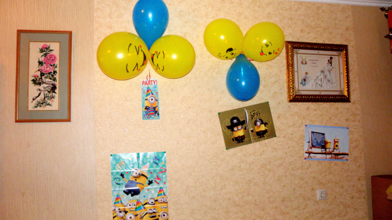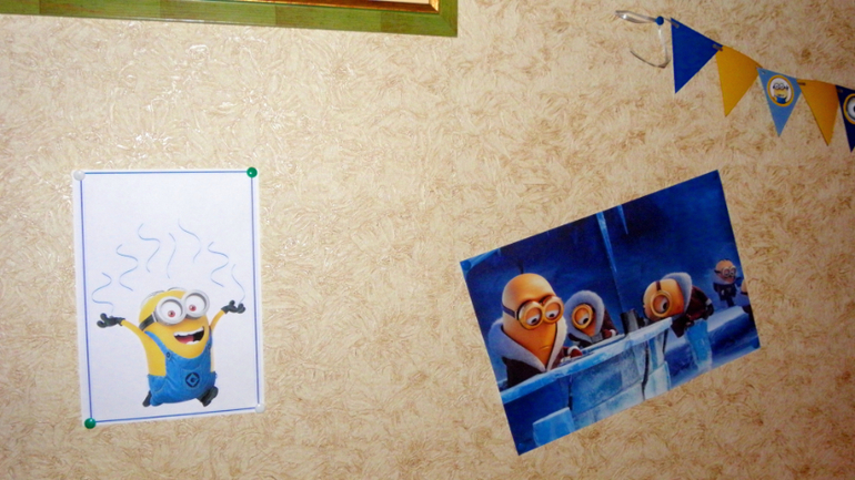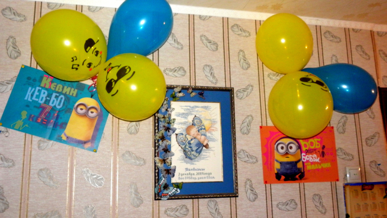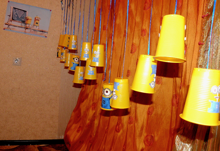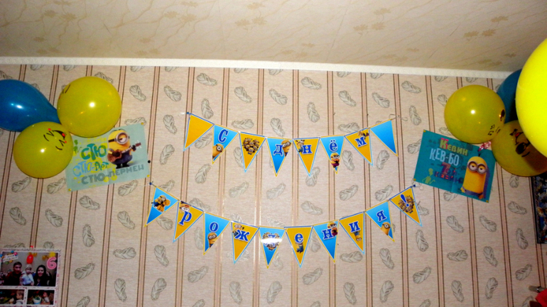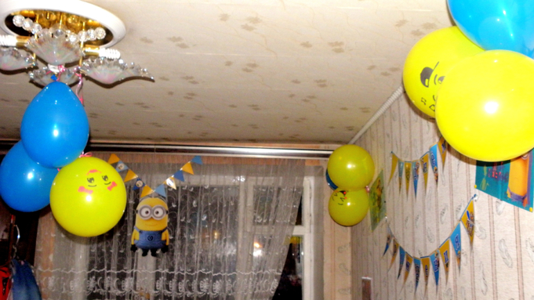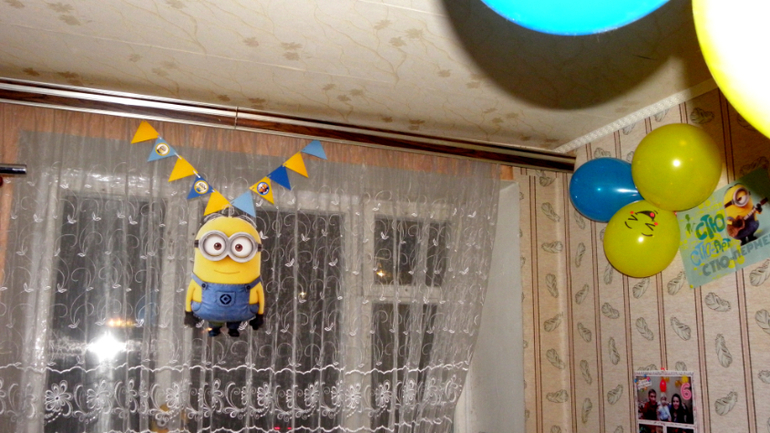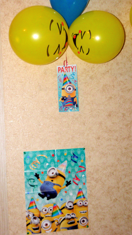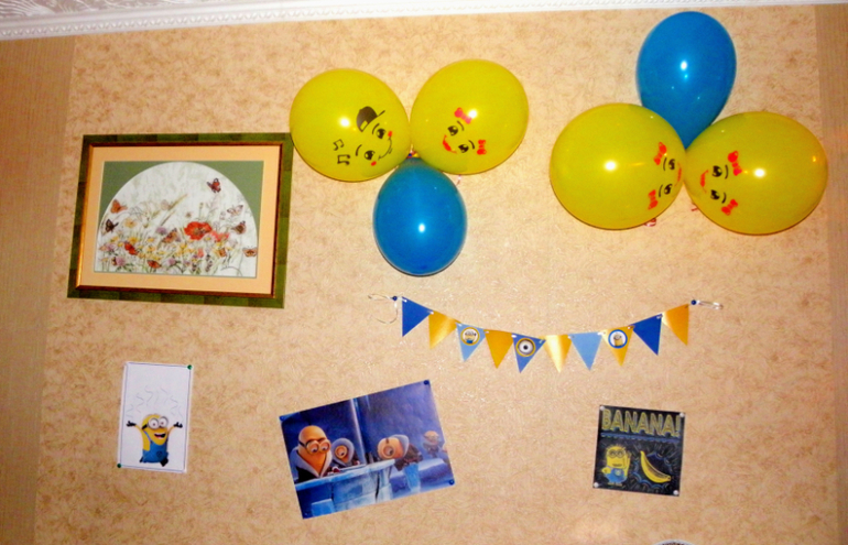Для украшения в комнаты купила обычный журнал с постерами Миньоны и развесила их по стенам,украсила шариками в нужном цвете и получилось довольно по Миньонски)