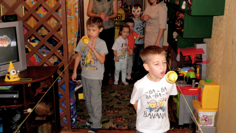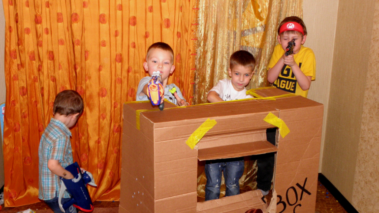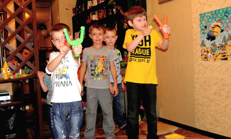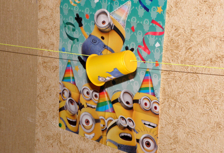 Затем я провела мальчишечий конкурс "РОГАТКИ",натянула веревочку с привязанными стаканчиками,дала рогатки и снаряды (пластмассовые баночки от киндеров с приклеенными глазками,получились мини миньончики),кто больше попадет по стаканчикам,тот и выиграл) дети довольны,еще бы,им разрешили стрелять)))