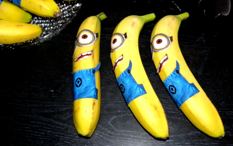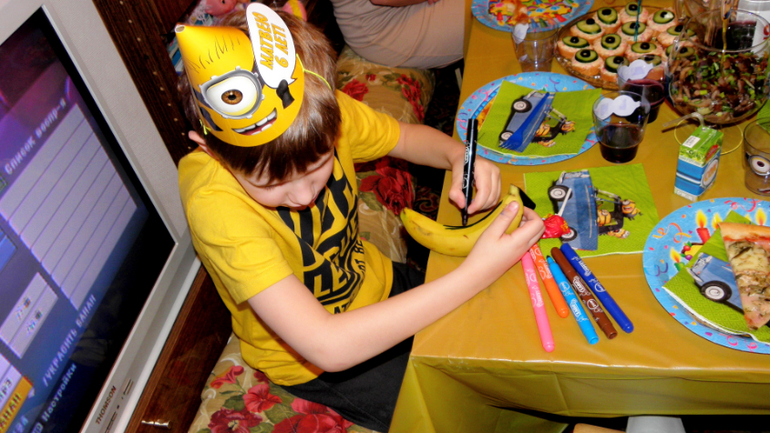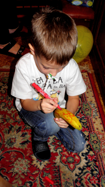 Пока дети не рванули в другую комнату играть,провела сразу же второй конкурс "УКРАСИТЬ КРЕАТИВНО БАНАН",раздала всем по банану,фломастеры и коробку с нитками разных цветов,дальше только полет фантазии каждого)
