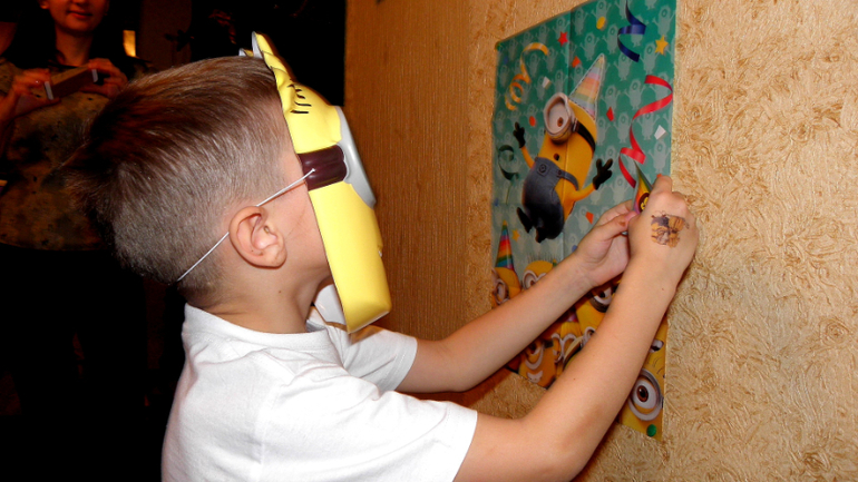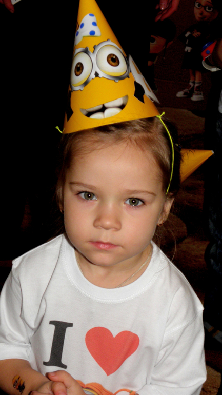Второй конкурс провела "ПРИКРЕПИ КОЛПАК МИНЬОНУ НЕ ГЛЯДЯ",игра покупная,очень удобная,входит туда плакат и колпаки самоклеящиеся,для глаз я купила маску миньона и заклеила ему глаза,получилось и смешно и удобно для детей,надел/снял,никаких завязываний повязок)