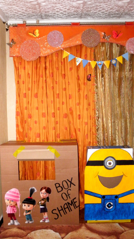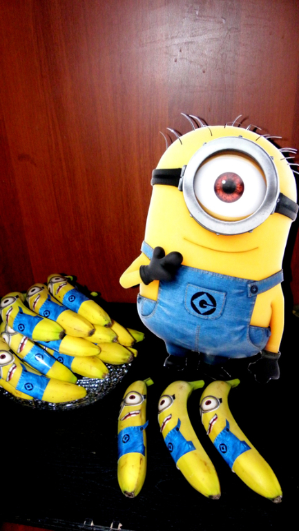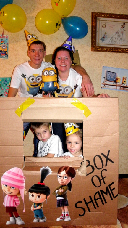 Для фотосессий и конкурса с бананами,сделали сами вот такие коробки,миньона рисовала наша бабушка,в прочем как и всегда на всех наших ДР)