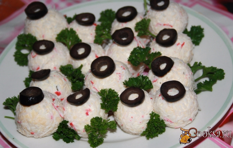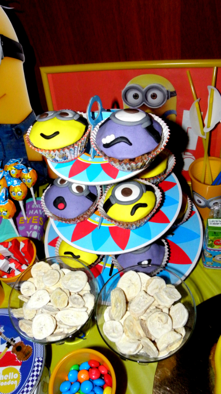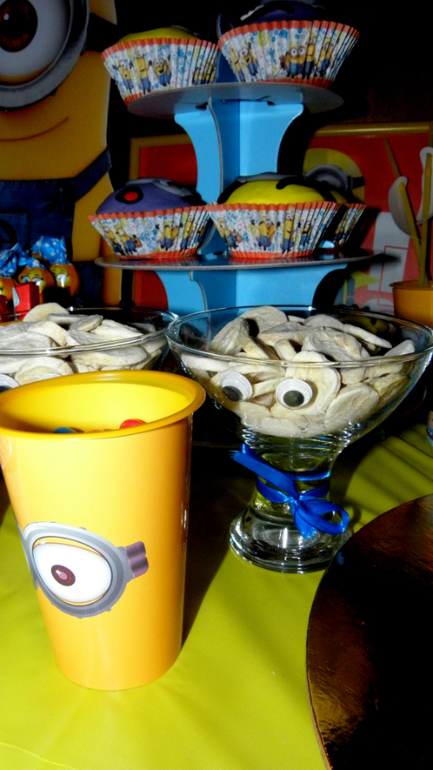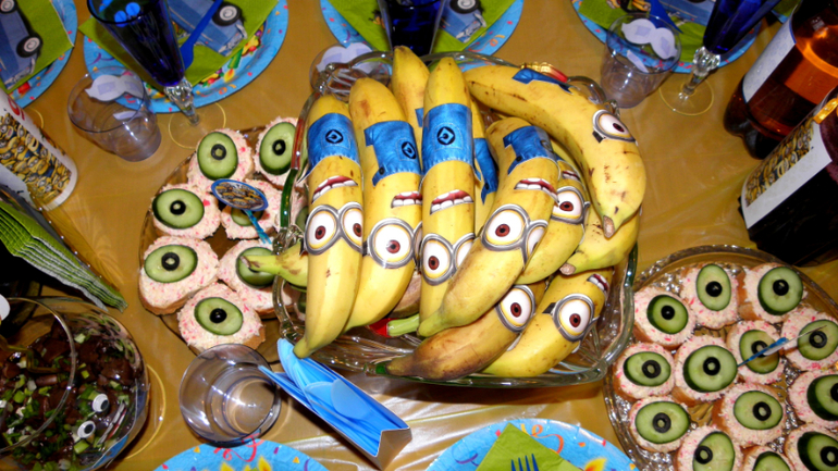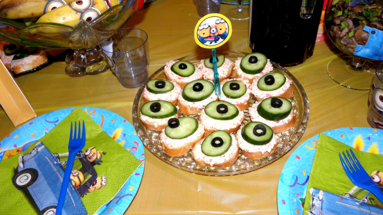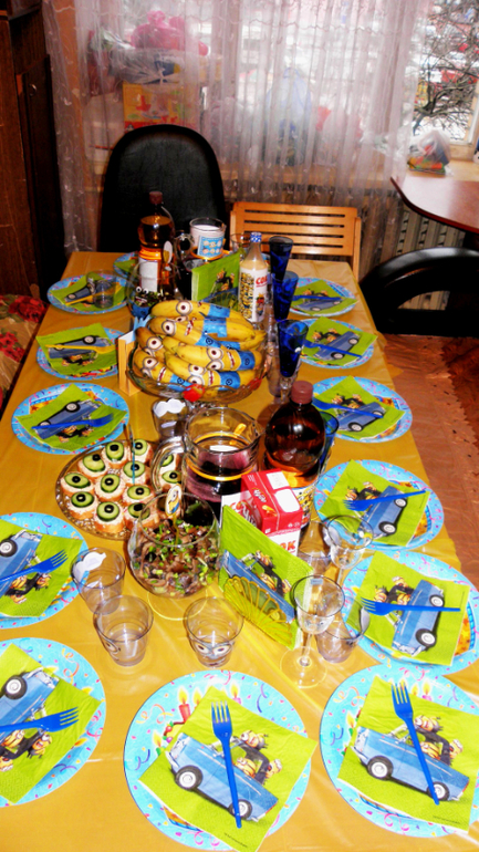 А вот стол сфоткали только в начале оформления,поэтому не все блюда вошли( Был и салат с глазами миньона,была пицца,мы сразу реши сделать стол закусочным,потому что дети все равно не сядут за стол нормально поесть (так и было,затаскивали их силком туда),были мешочки из блинов (фото с инета) и вот такие глаза (фото с инета)....Голодным короче никто не ушел)