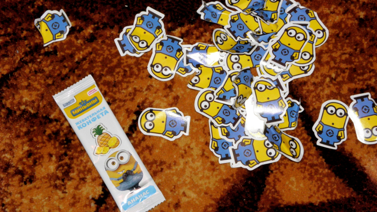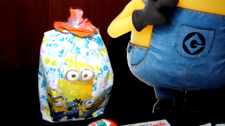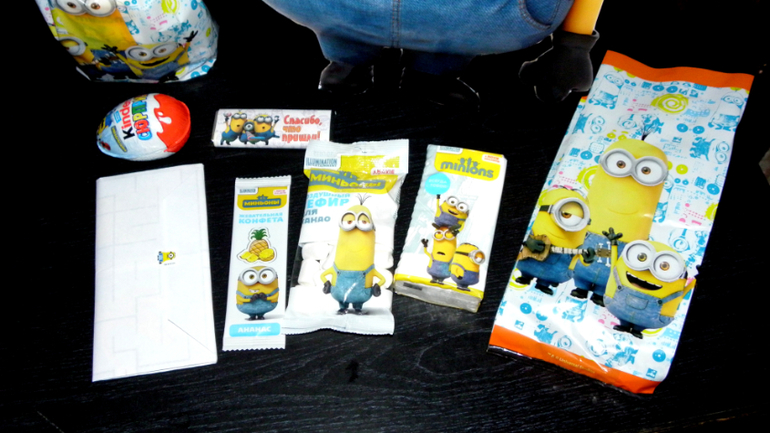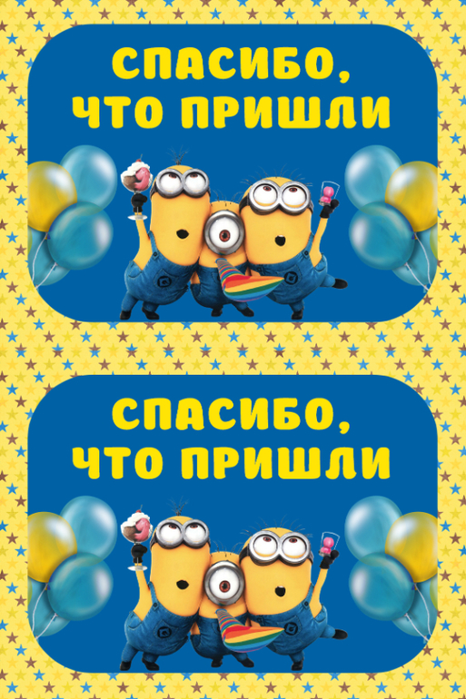 Для подарочков для гостей,купила вот такие вот пакетики и положила туда: зефирки и жевательные конфеты с миньонами (в Кораблике брала),платочки носовые (В Пятерочке брала),киндер яйцо с Миньонами,шоколадка с предсказаниями и конвертик,который сделала сама,сам конвертик это лабириант с миньоном (складывается легко,в инете полно мастер классов),а в нем карточка с надписью Спасибо что пришли) Так что сюрпризов в подарке хватало,и шоколадка сюрприз и белый непонятный конвертик,который развернув удивляет)))
