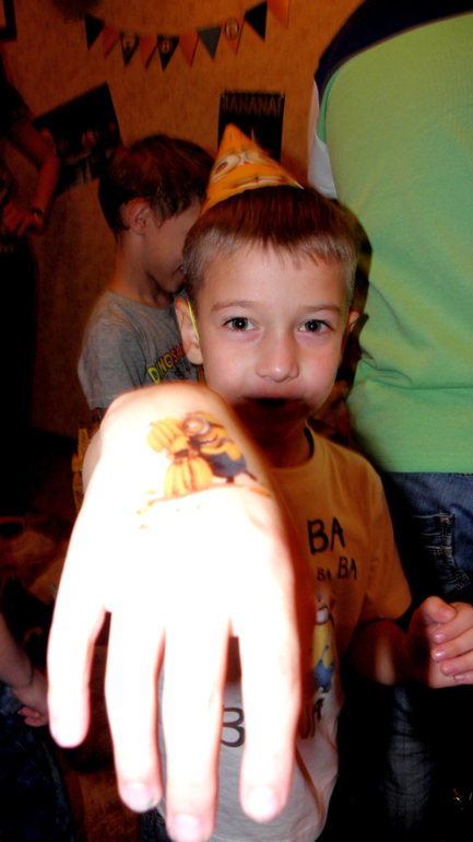 С приходом гостей начали процесс посвящения в Миньоны с помощью татуировок и колпаков) Некоторые пришли в тематической одежде с миньонами,за что им отдельное спасибо)))