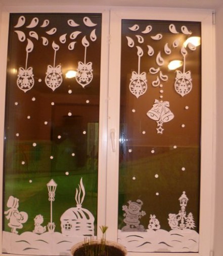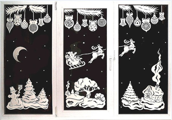 Очень много красоты у нас приготовлено, много картин, вырезанных из бумаги, огромное количество снежинок, будем делать гирлянды. В этом нам помогла наша бабушка. Они в школе с детками делают такую красоту, и завтра на окнах у нас будет вот что