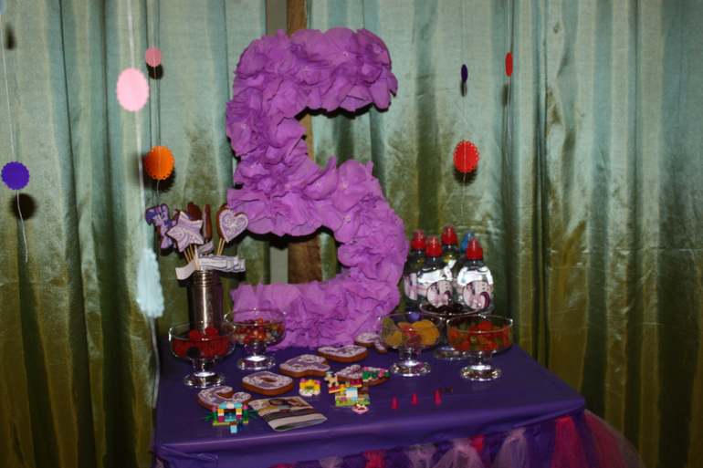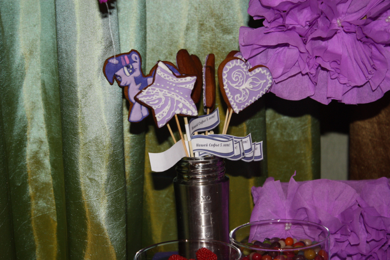 В каком стиле делать праздник долго спорили с дочкой - она очень уж хотела все в стиле "Пони Искорка", мне не хотелось повторяться - тк это же было несколько месяцев назад у ее подружки. Немного посмотрев что предлагается в интернете из декораций, сервировочных штучек и тортов, обсудив, доченька сдалась и сказала - "Ну, ладно, давай Принцессу Софию.!.." Я сделала хитрее и на первое празднование - в сам День рождения (назовем его "репетиционное празднование"), в будний день с детками с района было все в стиле Пони, а уже в субботу, где были родственники и друзья и братья-сестры - там Принцесса София. да..было два торта и два дня празднования ))))