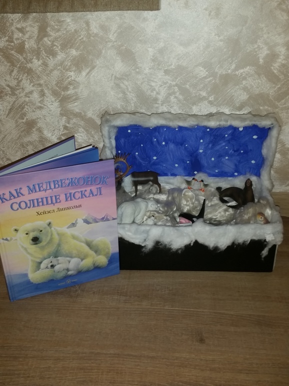 Что нужно: коробка, вата, искусственный снег, фигурки животных Guliver (у нас), книжки про животных