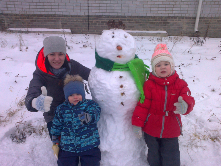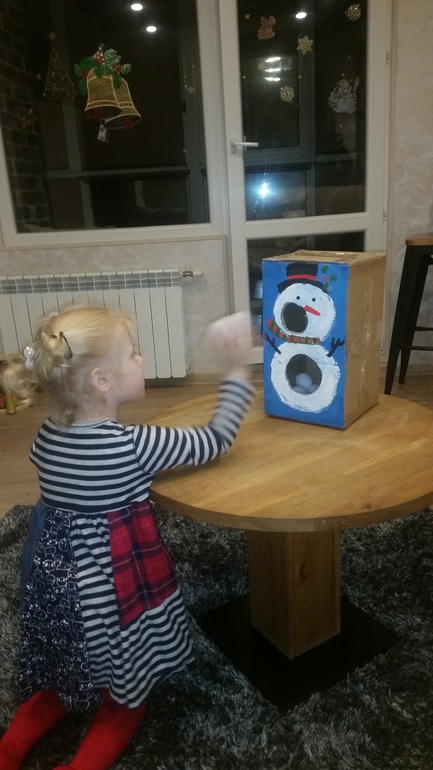Что нужно: снежки из ваты, фигурка снеговика, на улице -снежколеп