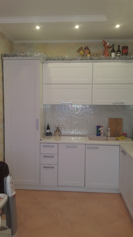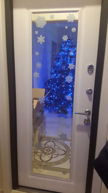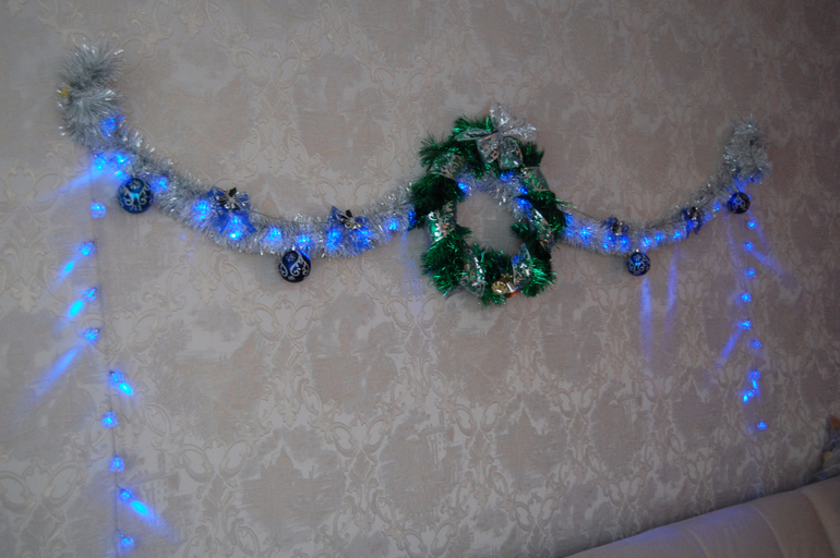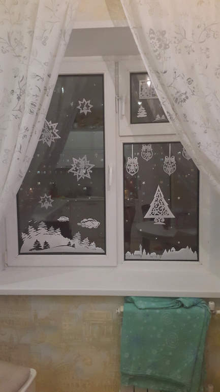 так скромненько украсили кухню, просто мишура на шкафах и вытынанки на окне