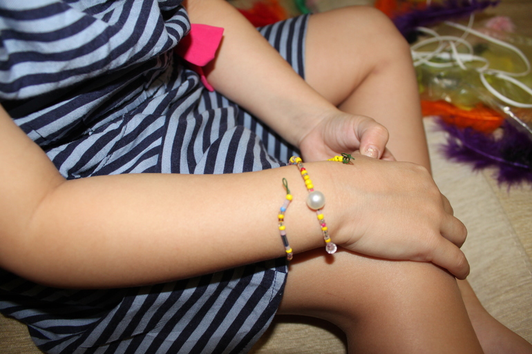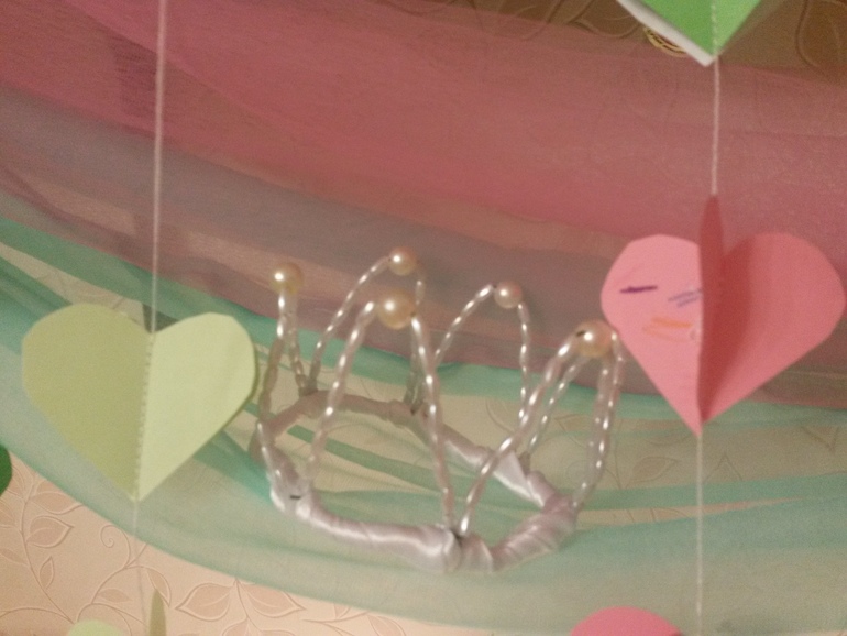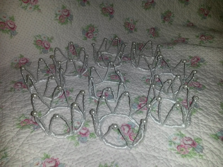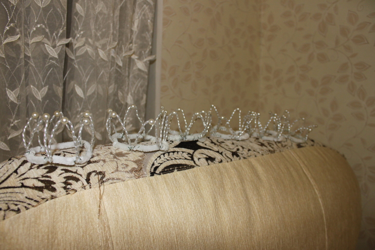 Бумажные короны делать не хотелось, сотворили из бусин и бисера! Варя мне помогала нанизывать. Всего 9!!!маленьких корон (одна для Катюшки, она из других бусин, те закончились). Чтобы основание не кололось, там же всё-таки проволоку закрепляли, обмотала его лентой, закрепив конец термопистолетом.