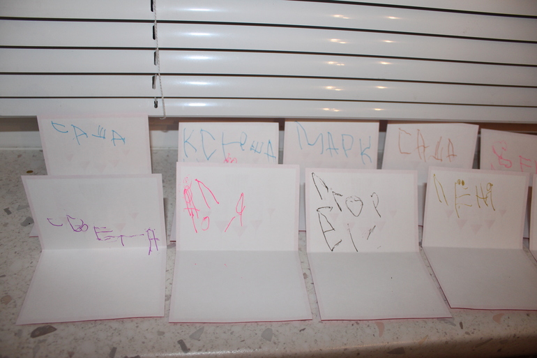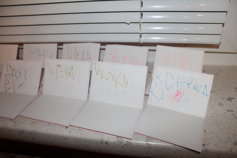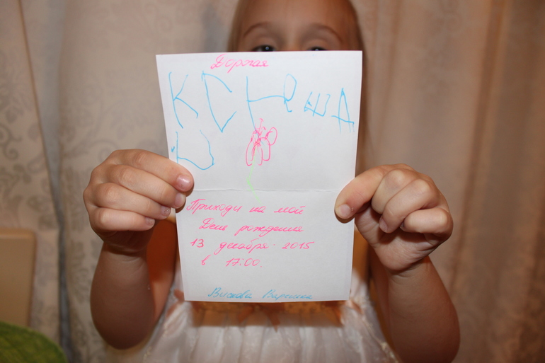 Для начала о приглашениях. Изначально приглашалось 12 гостей (по факту на празднике было 6 гостей+Варя), Варя бы и больше позвала, но к этому я пока не готова))) Варя САМА подписала каждое приглашение, это первый опыт написания слов (да и буквам её никто целенаправленно не учил). Я показывала, как писать, Варя очень старалась. Горжусь своей девочкой - 12 имён за один присест поздно вечером - это подвиг!