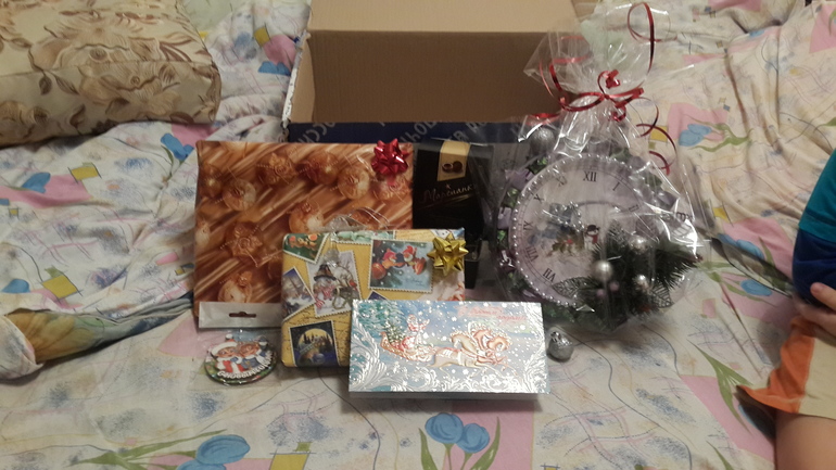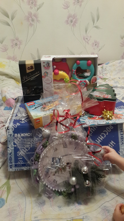 Очень красивые часы ручной работы из конфеток,еще конфетки,чай, магнитик уже на холодильнике ))игрушка на елки)))от Лего сынуля в восторге))там 3 в 1. А для дочи музыкальное зеркало ))