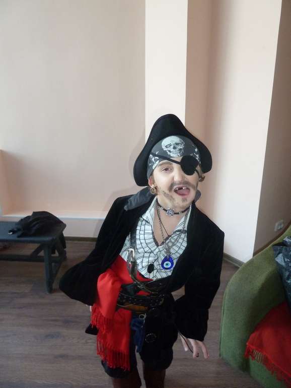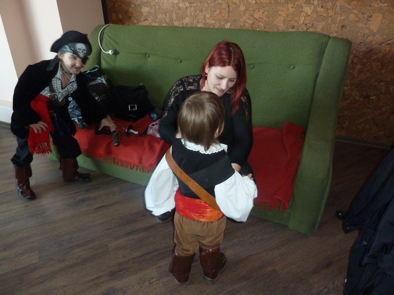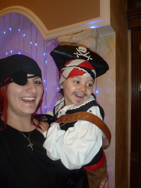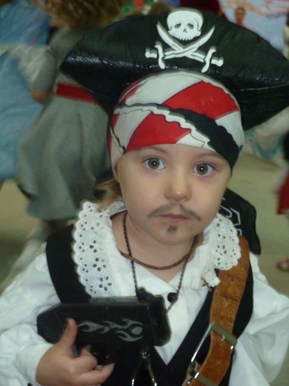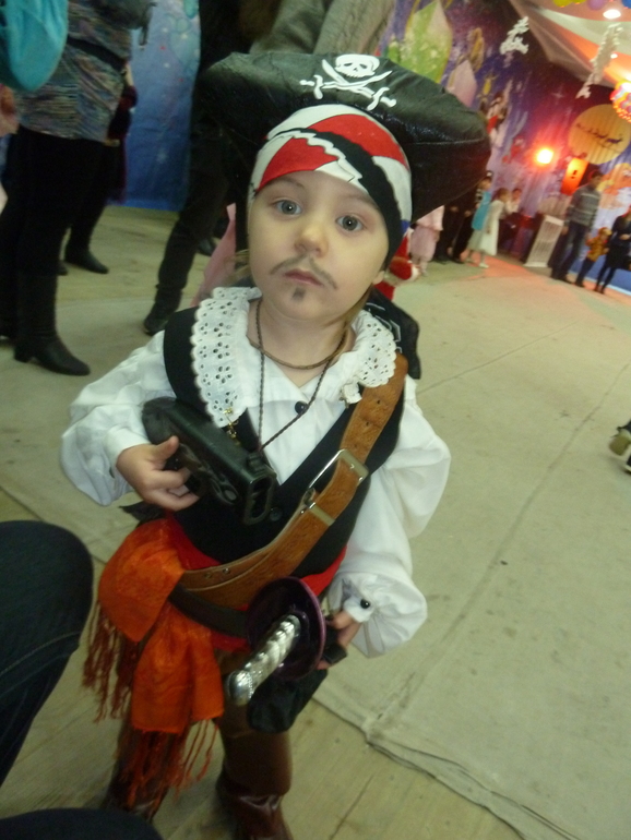 Супер костюмы! Старшенький прямо вошел в образ)))) А младший еще "зелененький" пират, глазенки наивные)))