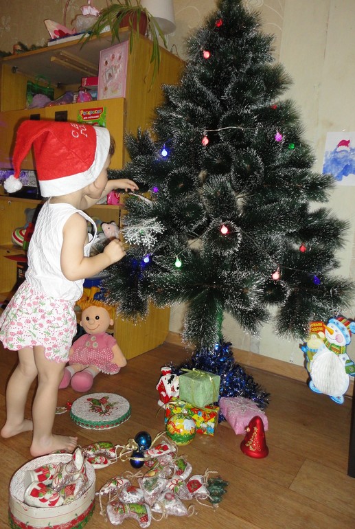 А это уже дочка сама украшает елочку!!! С каким удовольствием она это делала!!! Потом правда и деду, приехавшему в гости, досталось...давай, говорит, и ты будешь нарядным! И дед, лежа на диване, оказался весь в мишуре)))