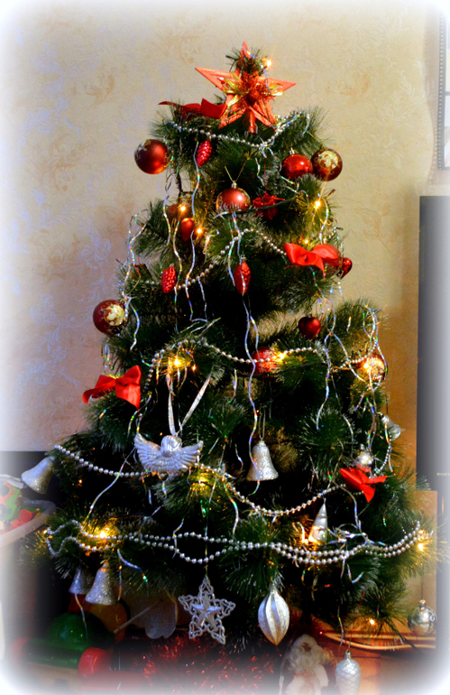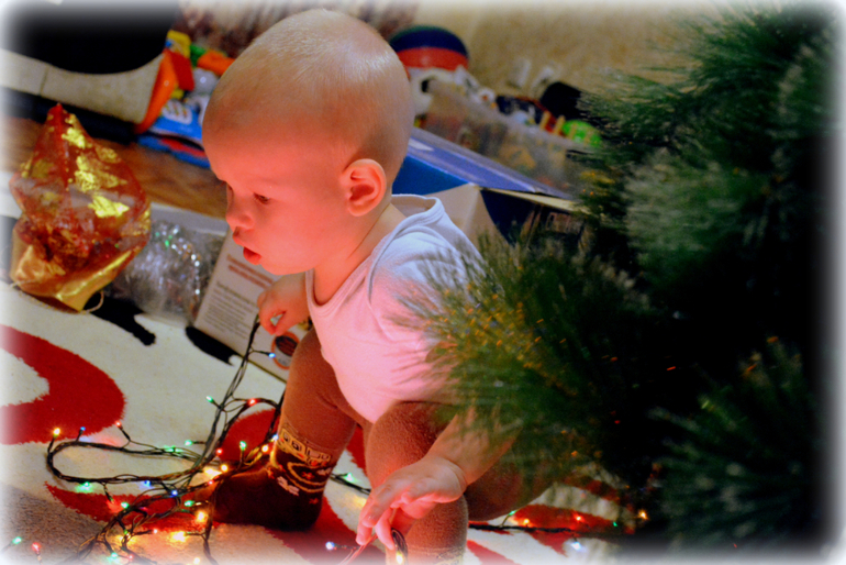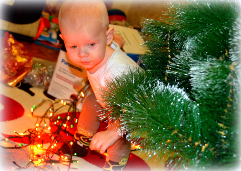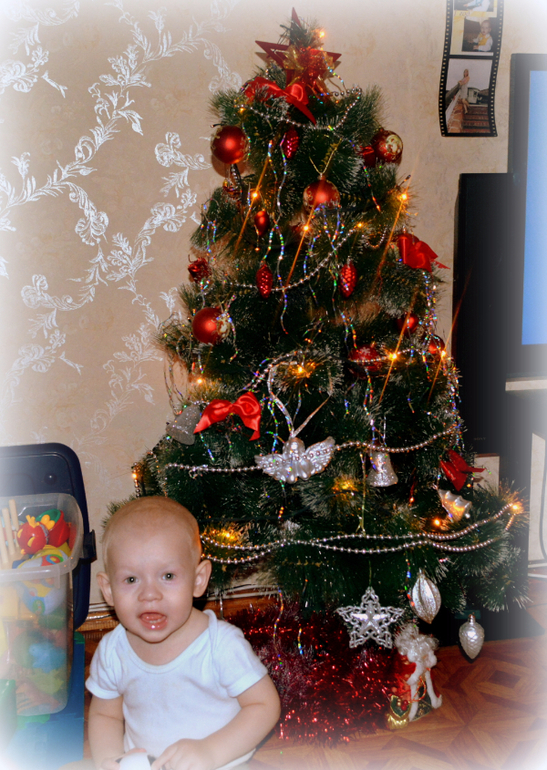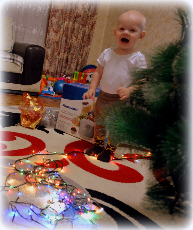 Начали с елочки. Она у нас небольшая, но мне нравится. Первый раз стоит на полу, но младший вроде не трогает. Цветные гирлянды привели его в восторг, даже танцевал по ним от радости)