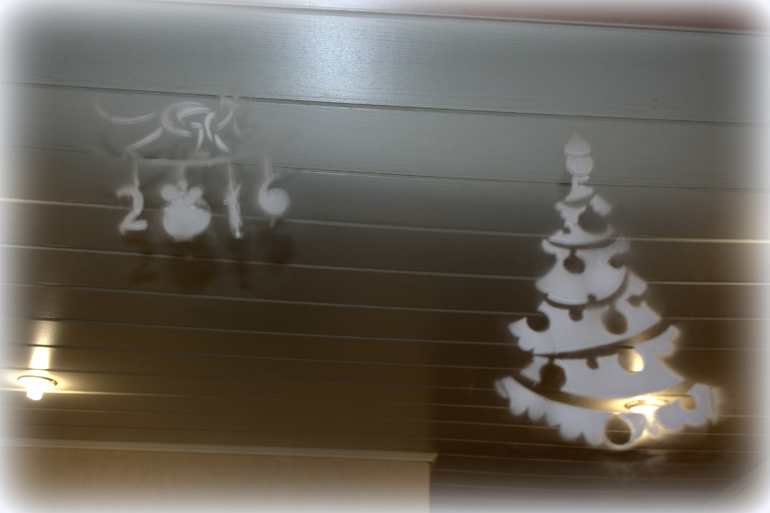 Пыталась на зеркале снегом по трафаретам сделать рисунки)