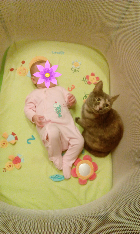 Это наша нянька- кошка, которая ни на минуту не отходит от малышки: