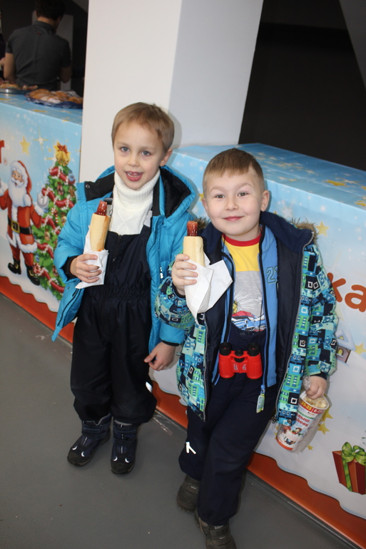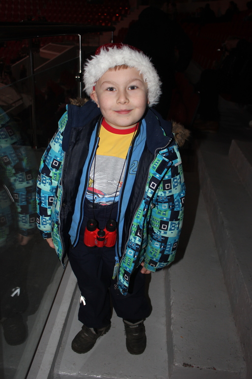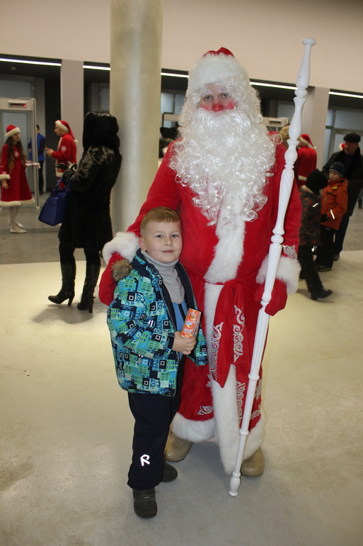 На представление ходили мы большой компанией. Я со Славой, моя подружка с сыночком, моя мама и родители подружки... Приехали заранее. нас впустили быстро, раздеваться не стали. Так как я знала, что внутри не так уж и жарко.. На входе сфотографировалисьс дедом Морозом. Не таким красивым ка кна предыдущих елках, но все же с дедом Морозом.