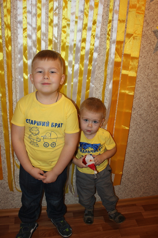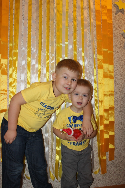 Над атрибутикой долго не раздумывала... День рождения солнечный, а значит много желтого. Праздник звездный, значит кругом звездочки. Сыночкам были заказаны желтые футболочки. Я долго думала, какими они будут, как их оформить в едином стиле для сыночков. И вот результат.