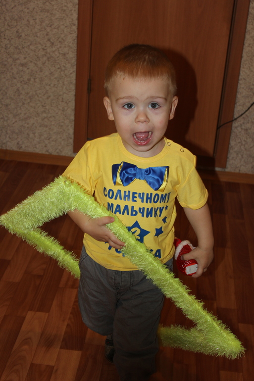 Темик гонял с рамочкой и дед Морозиком в руках и так гонял до тех пор пока не начал валиться с ног. Ведь мы специально разбудили его рано, чтобы до прихода гостей успеть поспать хотя бы не долго...