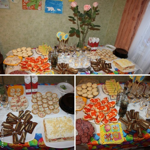Наш праздничный стол... Салатов мы не готовили... Слоеный торт и различные закуски...