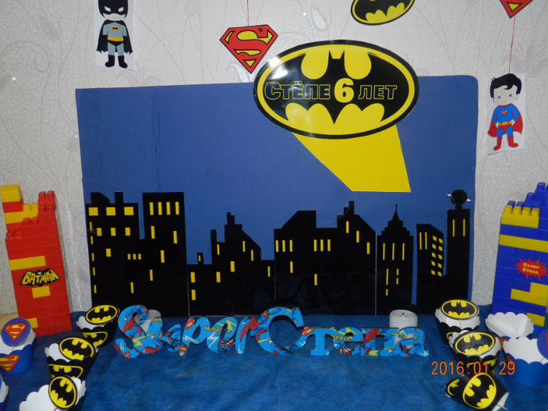 Простите,поздно увидела. Еще актуально. В интерете искала картинки ночного города бэтмена в хорошем качнстве,потом распечатала,вырезала и приклеила на большую доску. Там получилось несколько домов,соединила их. Супермена логотип нашла в интернете,но доделывала сама в фотошопе