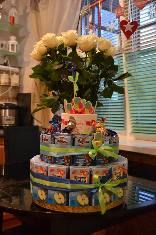 Из угощений я готовила пальму из фруктов, сосиски осьминожки ну и сладости, торт, кексы, шоколадки.