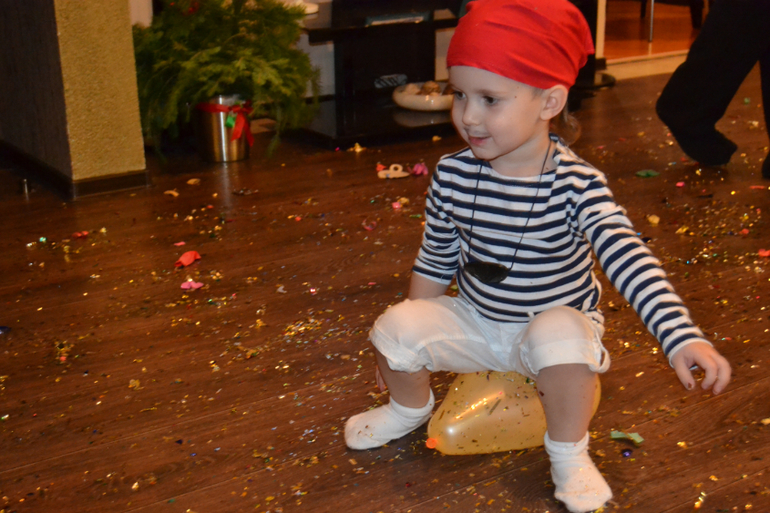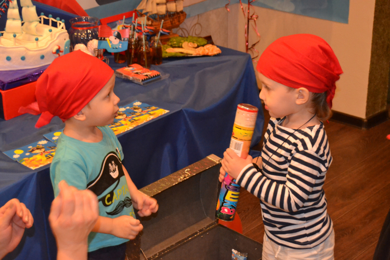 Развлекались мы разыскивая клад. Подготовил нам папа карту , напечатали детям картинки где искать подсказки и в конце нашли сундук с сокровищами (идея была, что при открывании сундука оттуда полетят шарики, но таких маленьких взлетающих шариков как оказалось не бывает) и положили просто разные игрушки и хлопушки. Хлопушки с конфетти в квартире это вообще отдельная тема, но что не сделаешь для любимого сына. Пушечный залп был! Потом еще была пиньята, деткам очень понравилось что из нее посыпались как дождь куча конфеток,свистулек и всякого очень им "нужного".Лопали попами шарики ну и в конце торт со свечками.