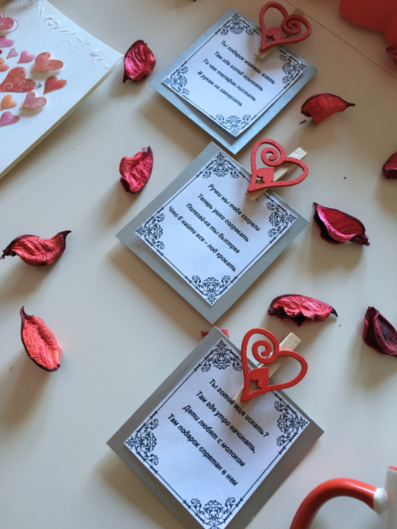 Вообщем, суть идейки была: в пути из записочек, по который муж искал презенты. тк мы любим квесты, сделала такую вот многоходовочку))