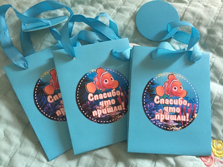 Купила пакетики для сладких подарков маленьким гостям, оформила наклейкой "Спасибо, что пришли". Внутри мыльные пузыри и жевательный мармелад в виде дельфинов.