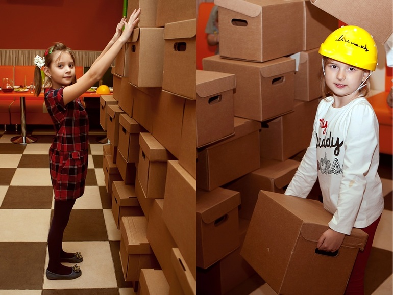 Девочки строили город. Мальчики же предпочитали более активные игры. Затащили часть коробок в лабиринт, возвели из них баррикады и устроили перестрелку шариками из сухого бассейна.