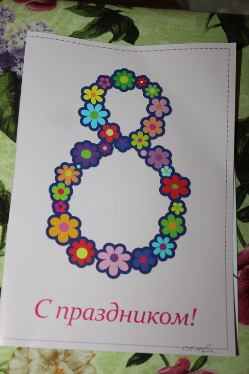 В этом году они просто превзошли все ожидания. Детишки нарисовали наши портреты, сделали букетики цветов в открытке из ватных дисков и вышили салфеточки. Приятно не передать.